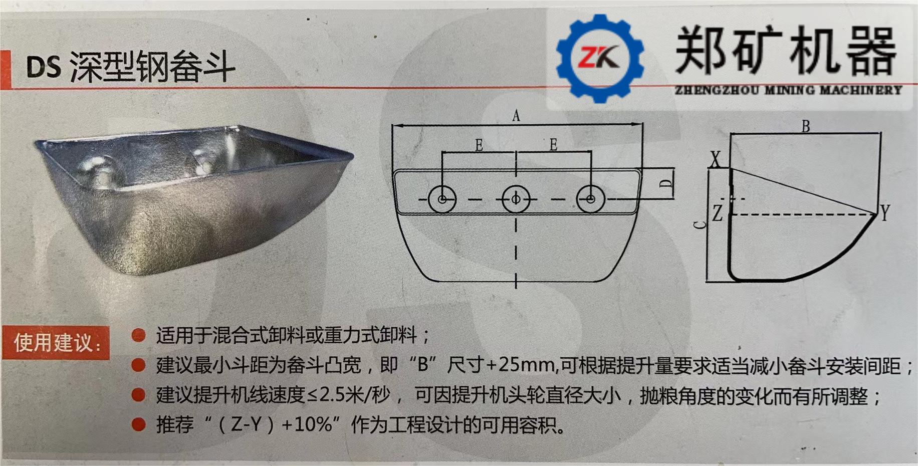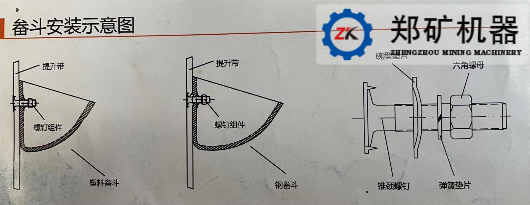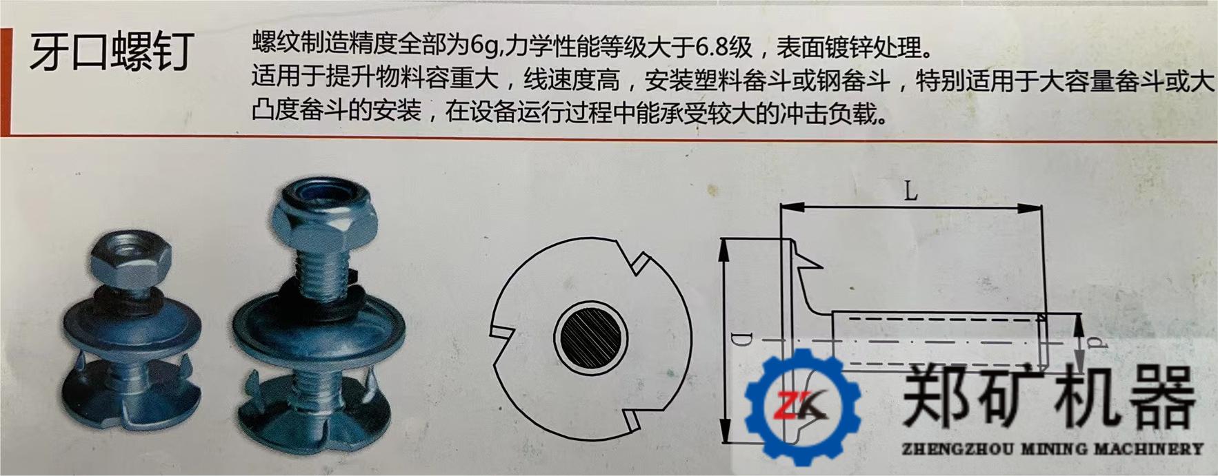 TD型膠帶式提升機采用膠帶作為料斗的牽引部件。料斗用具有特殊頭部的螺釘(牙口螺釘)固定在帶子上,為了使螺栓的頭部不妨礙膠帶通過(guò)滾筒,在料斗的后壁上制有相應的凹槽。膠帶的寬度要根據膠帶的標準選取,帶寬應比料斗的寬度在30-40mm。帶的帆布層數應根據帶子所受的最大牽引力計算確定(通常不少于4層),計算方法同帶式輸送機,但由于膠帶上鉆了連接料斗的孔,降低了膠帶的強度,所以應比膠帶輸送機驗算膠帶強度的安全系數增大10%左右。