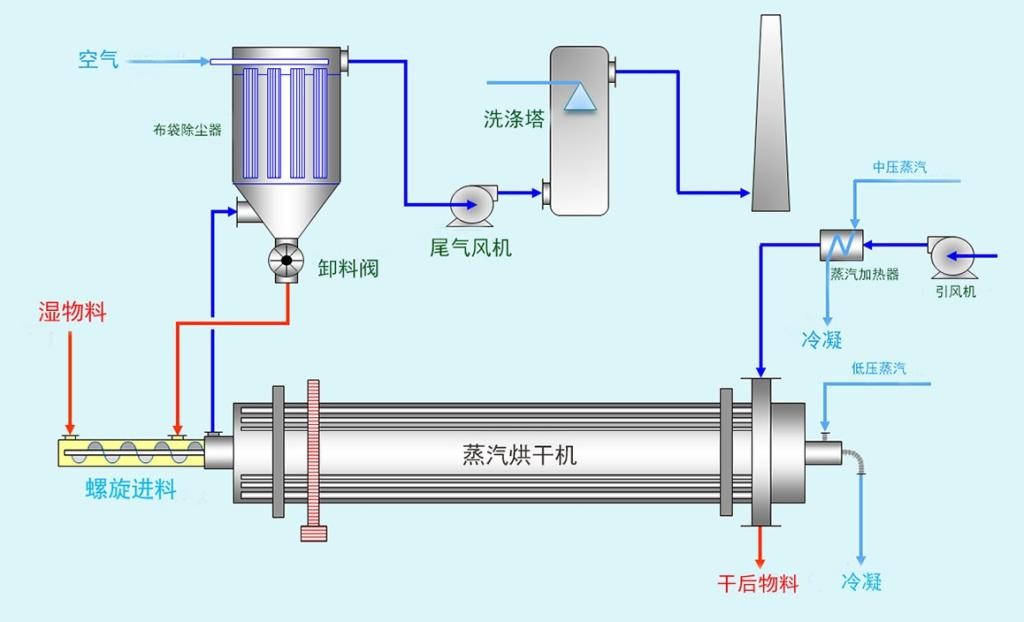 蒸汽回轉窯(蒸汽烘干機)是使用蒸汽為干燥介質(zhì),以傳導換熱為主,對流換熱為輔的新型先進(jìn)設備,可對多種物料進(jìn)行干燥和烘干的設備。
