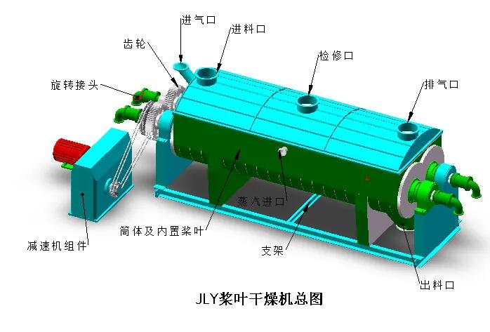 空心軸上密集排列著(zhù)楔型中空槳葉,熱介質(zhì)經(jīng)空心軸流經(jīng)槳葉。單位有效容積內傳熱面積很大,熱介質(zhì)溫度從-40℃到320℃,可以是水蒸汽,也可以是液體型:如熱水、導熱油等。間接傳導加熱,沒(méi)有攜帶空氣帶走熱量,熱量均用來(lái)加熱物料。熱量損失僅為通過(guò)器體保溫層向環(huán)境的散熱。楔型 槳葉傳熱面具有自清潔功能。物料顆粒與楔型面的相對運動(dòng)產(chǎn)生洗刷作用,能夠洗刷掉楔型面上附著(zhù)物料,使運轉中一直保持著(zhù)清潔的傳熱面。槳葉干燥機的殼體為W型,殼體內一般安排二到四根空心攪拌軸。殼體有密封端蓋與上蓋,防止物料粉塵外泄及收集物料溶劑蒸汽。出料口處設置一擋扳,保證料位高度,使傳熱面被物料覆蓋而發(fā)揮作用。傳熱介質(zhì)通過(guò)旋轉接頭,流經(jīng)殼體夾套及空心攪拌軸,空心攪拌軸依據熱介質(zhì)的類(lèi)型而具有不同的內部結構,以保證較好的傳熱效果。熱載體通過(guò)旋轉接頭送入干燥機,通過(guò)呈攪拌狀態(tài)的物料層表面,從另一側排出。